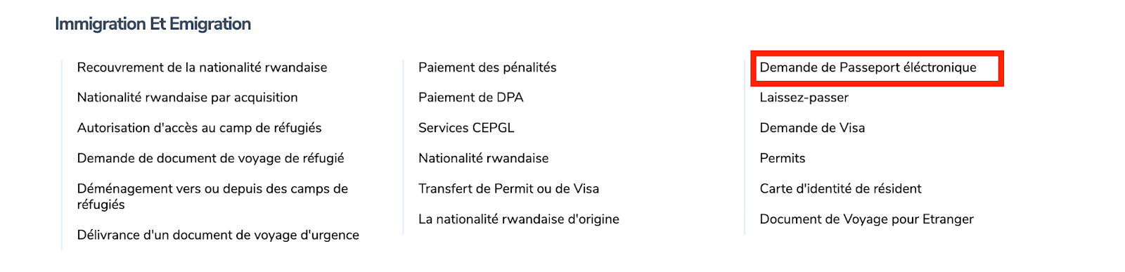 Visitez www.irembo.gov.rw et Sous Immigration Et Emigration, cliquez sur Demande de Passeport électronique.