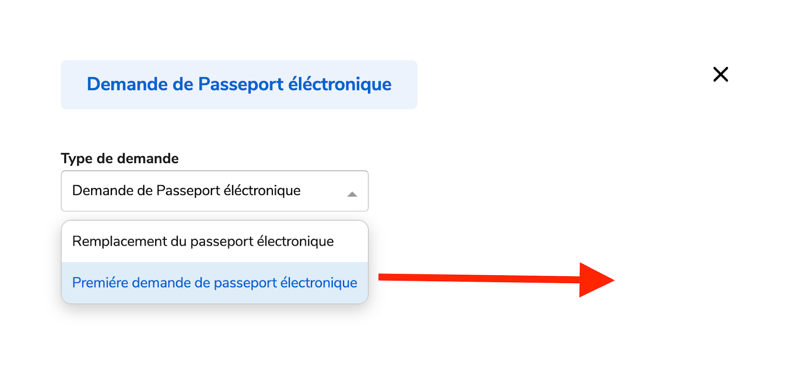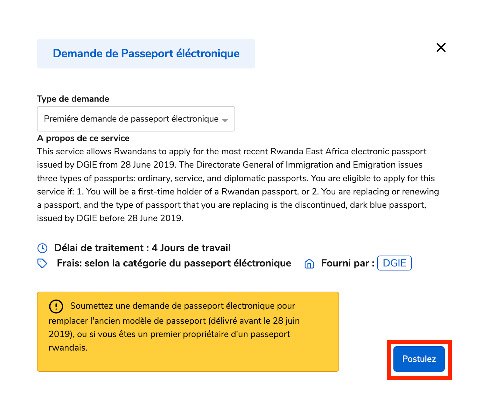 Sélectionnez le type de demande que vous souhaitez ; première demande de Passeport électronique, et cliquez sur « Postulez ».