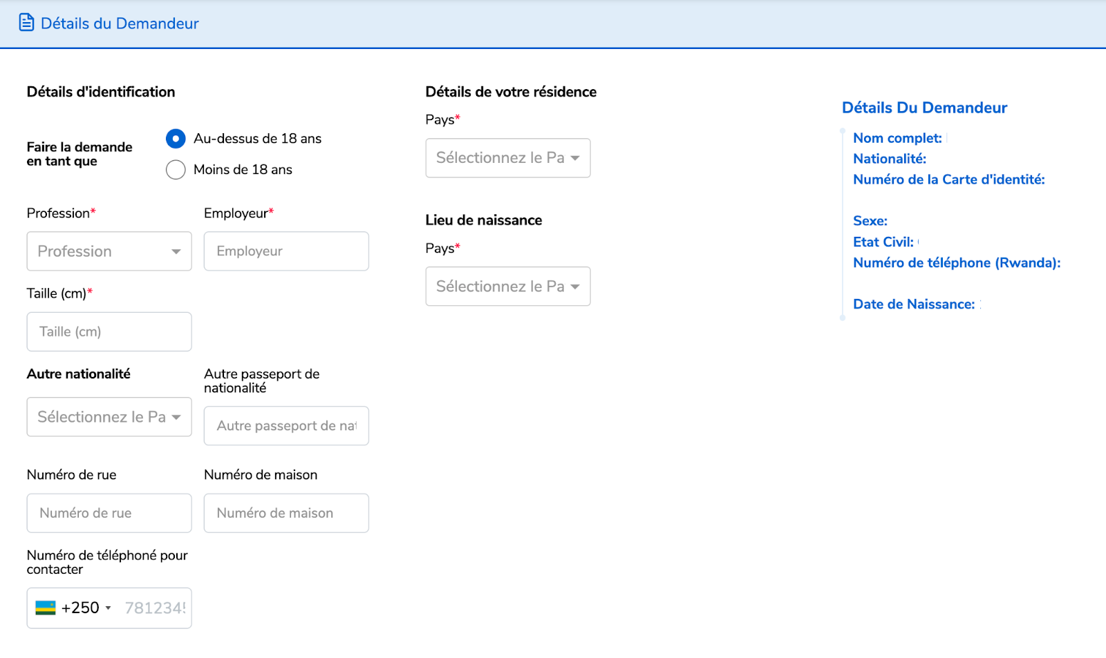 Remplissez les Détails du demandeur, en cliquant dans l'espace vide pour saisir les informations requises (* : signifie information obligatoire).