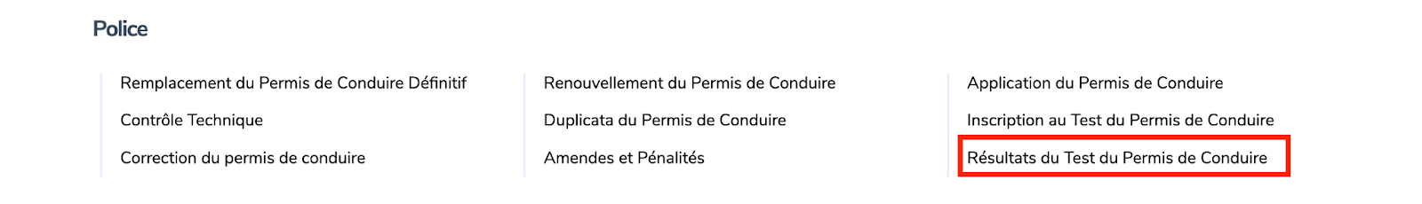 Rendez-vous sur www.irembo.gov.rw et, sous la catégorie Police, cliquez sur Résultats de l'examen du permis de conduire.