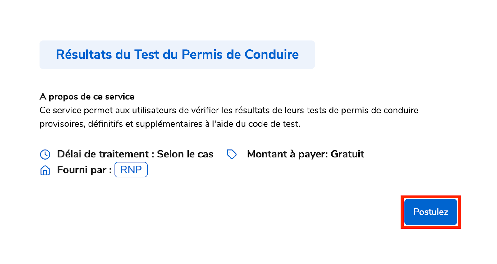 Le délai de traitement de ce service dépend du type d'examen de permis de conduire et il est gratuit.