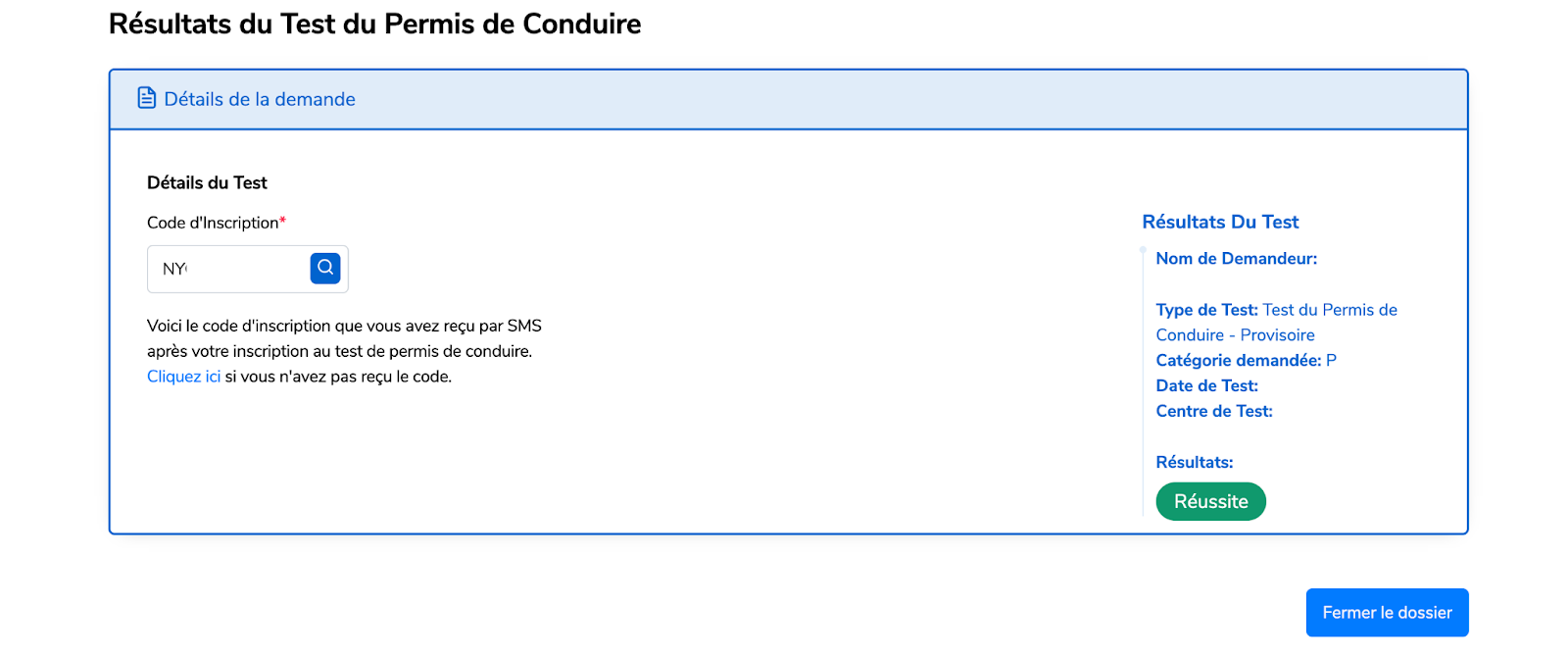 Ce service permet aux candidats de vérifier les résultats de leur examen de conduite provisoire, définitif et supplémentaire en utilisant un code d'inscription. Les demandeurs doivent être en possession du code d'inscription reçu par SMS après s'être inscrits à l'examen de conduite.