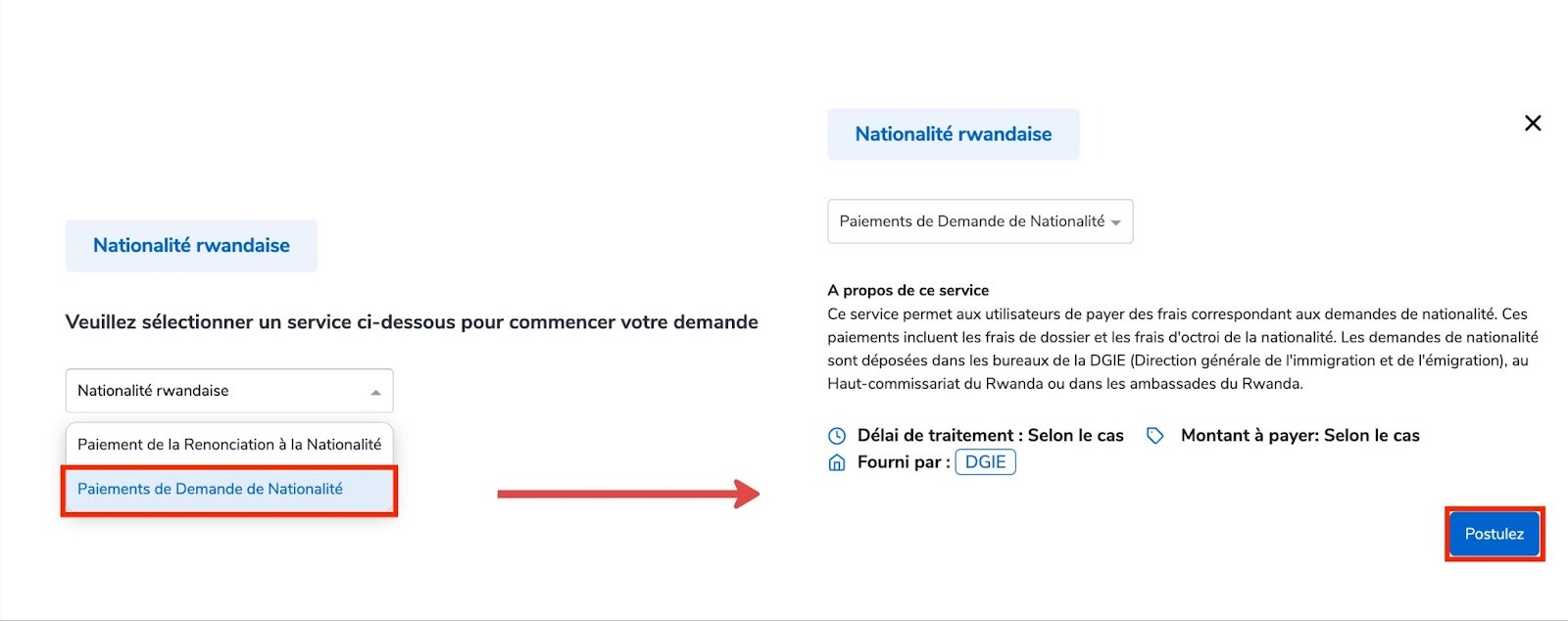 Choisissez " Paiements de Demande de Nationalité ” choisissez le type de demande, puis cliquez sur Postulez.