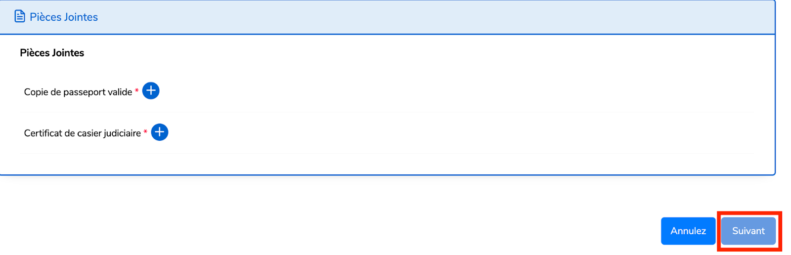 Joignez les pièces jointes requises,puis cliquez sur “Suivant”.