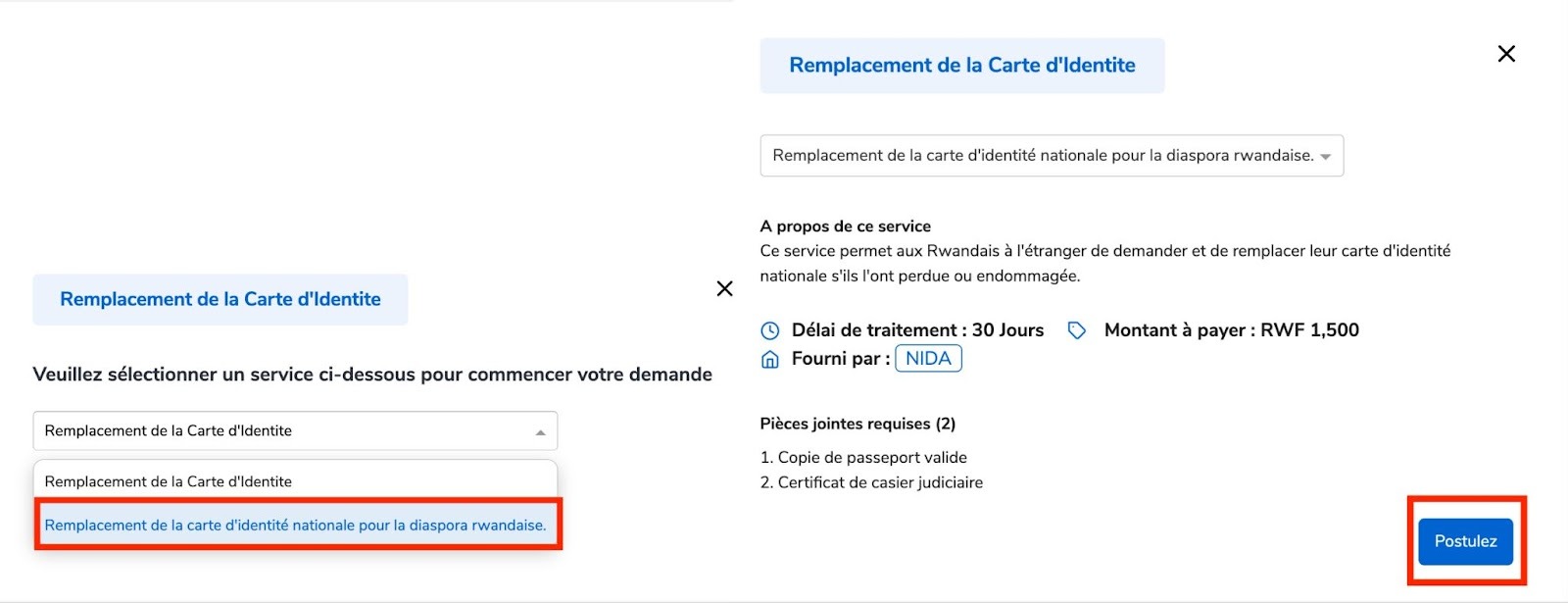 Sélectionnez “Remplacement de la carte d'identité nationale pour la diaspora rwandaise.”,puis cliquez sur “Postulez”.