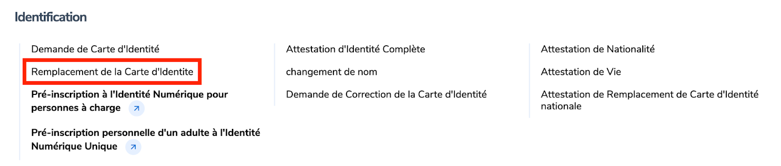 Rendez-vous sur www.irembo.gov.rw ,sous “Identification”,choisissez “Remplacement de la Carte d'identité”.