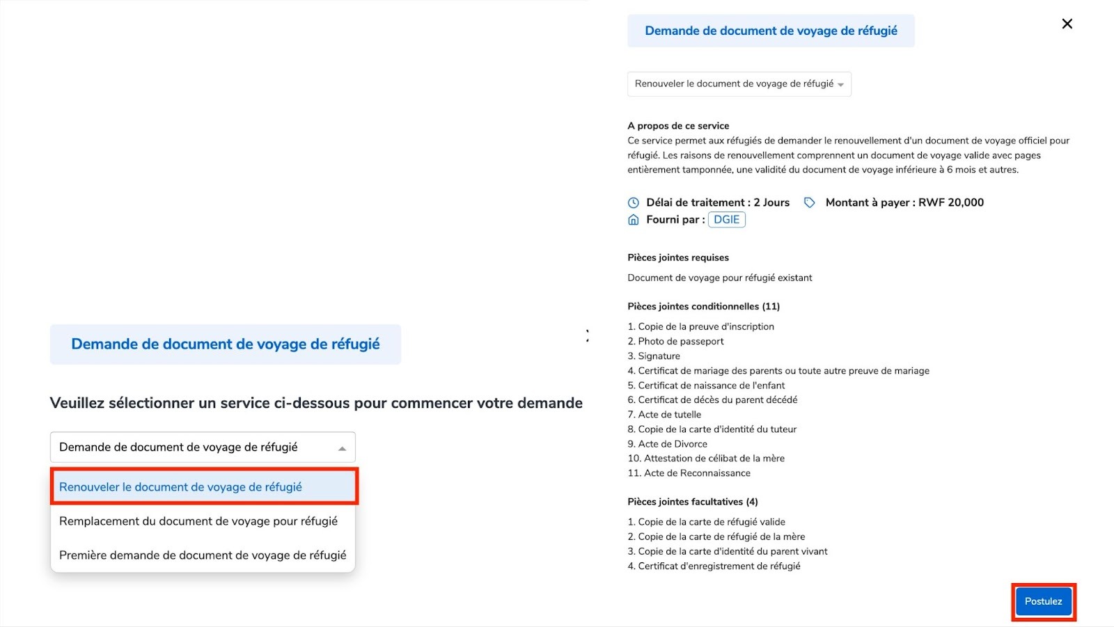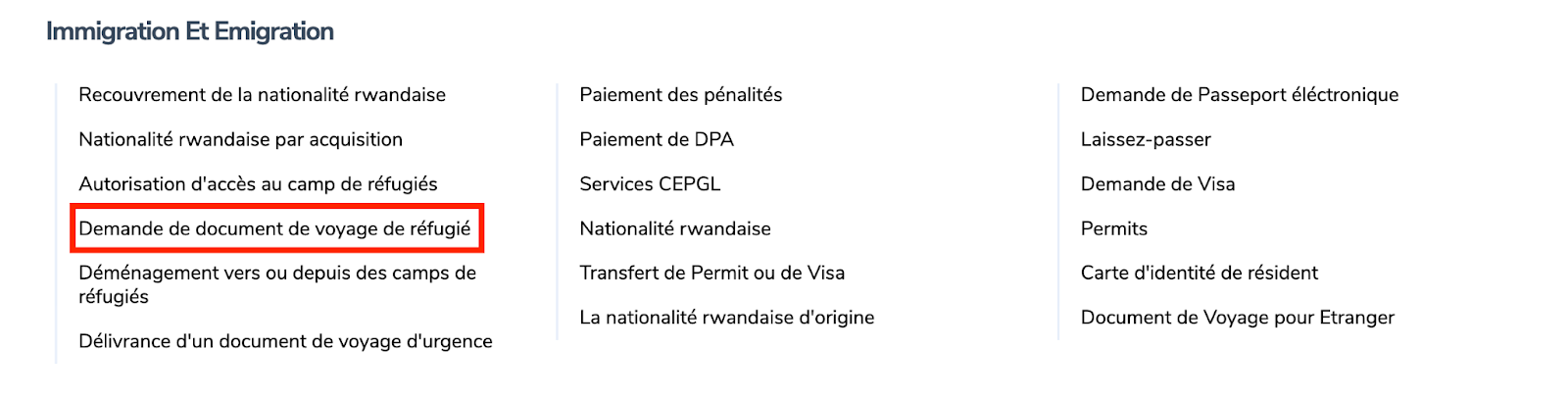 Visitez www.irembo.gov.rw et Sous Immigration Et Emigration, cliquez sur “Demande de document de voyage de réfugié”.