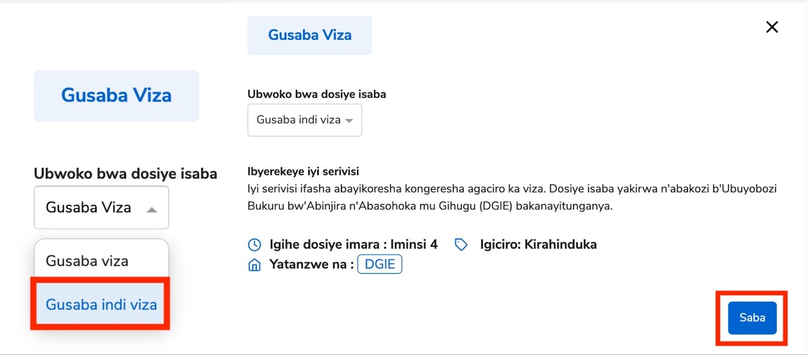 1. Hitamo “Gusaba indi viza”, hanyuma ukande “Saba”.
