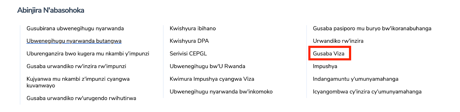 • Niba usaba serivisi  atizeye neza Ubwoko bwa Viza akwiye gusaba, agirwa inama yo kubaza mu biro by’Urwego rw’igihugu gishinzwe Abinjira n’Abasohoka anyuze kuri imeyili: visa@migration.gov.rw cyangwa agahamagara kuri +250 722 17 29 74 mbere yo gutangira gusaba.