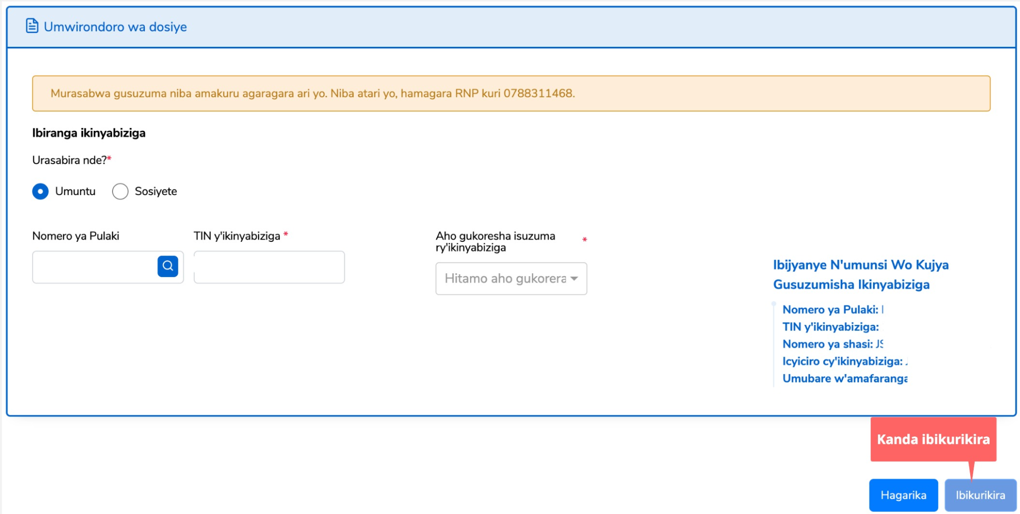 Hitamo uwo usabira “Ndisabira” cyangwa “Sosiyete,”. Uzuza Umwirondoro wa dosiye. imyirondoro y’ikinyabiziga ihita igaragara hejuru kuri paji.